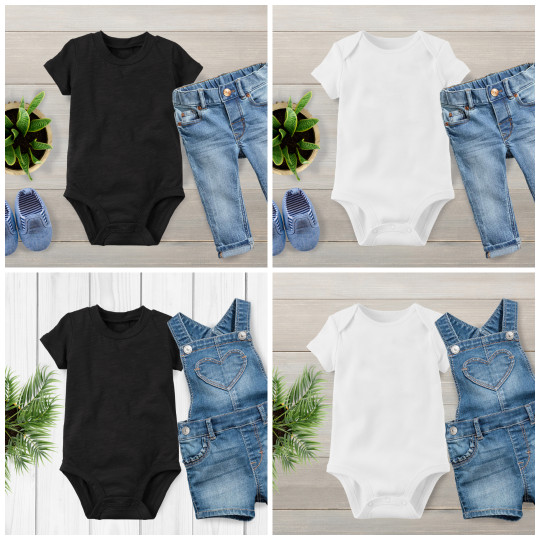 الصورة تحتوي على 4 مشاهد مختلفة لبدلات أطفال (أبيض وأسود) بتنسيق Flat Lay مع ملحقات عصرية مثل بنطلون جينز، أفرول بتفصيلة قلب، وأحذية أطفال لطيفة، مع خلفيات خشبية متنوعة تضفي لمسة طبيعية دافئة.